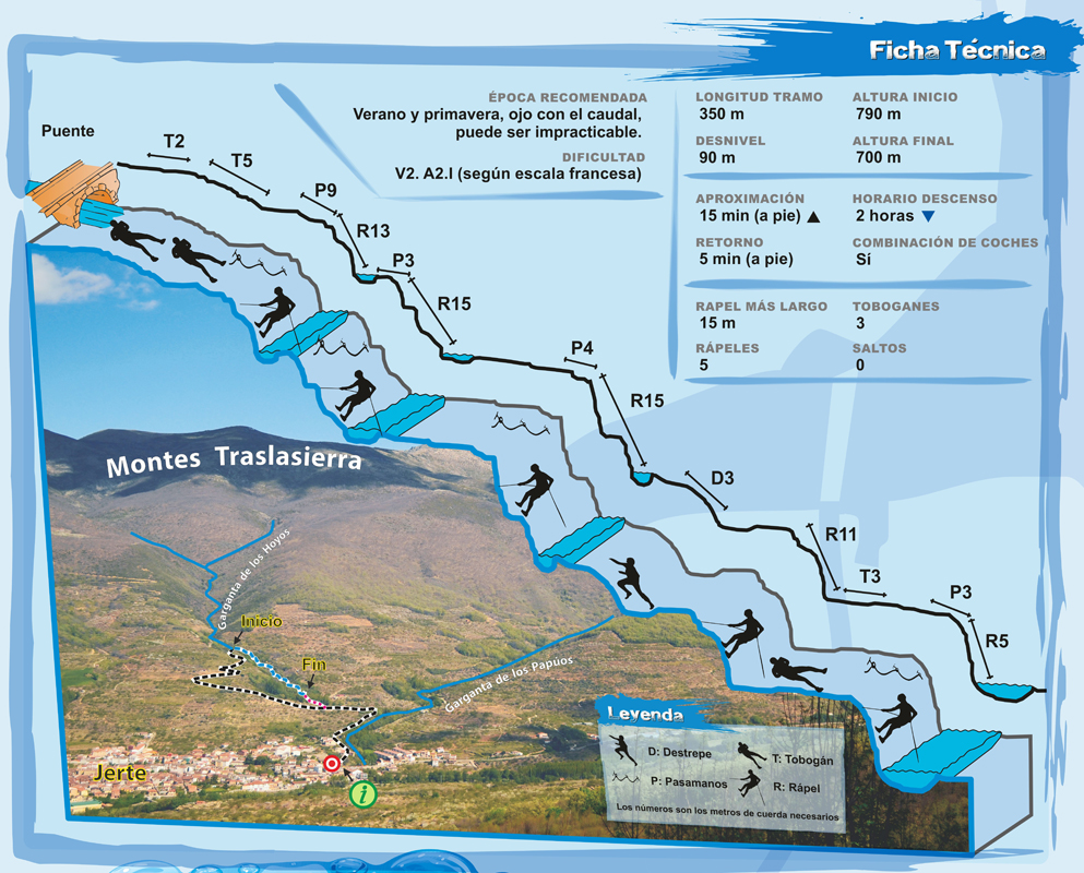 Los Hoyos ravine is small and particularly suitable for beginner canyoners who want to perfect their installation technique, with fun rappels, slides and amazing corners, since the reality is totally different from what it looks like from the outside. Next to the town of Jerte, this place hides its secrets very well. Access is very short and it is possible to combine cars.