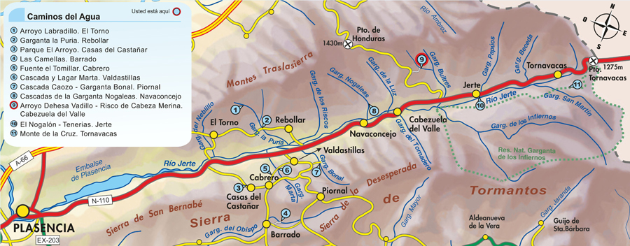 Viewpoint that is accessed via Honduras Port. This is a European protected space, the Sierra de Gredos and Valle del Jerte Site of Community Importance (LIC), which helps with the conservation of natural habitats and wild flora and fauna. Next to the Cabeza Merina Cliff and Los Buitres Ravine is where a visitors can see a combination of granite cliffs, rock birds, Pyrenean oak forests, chestnut and cherry trees, gallery forests (of sycamores, ash trees and willows) and, of course, a little known waterfall: Vadillo Pasture Creek waterfall, which looks its best during periods of rain and thaws. This creek flows through a craggy place plagued with vultures and other rock birds, but the queens of the summits are golden eagles and Bonelli’s eagles, whose silhouettes still fly over these valleys and sierras to the delight of ornithologists and enthusiasts.
