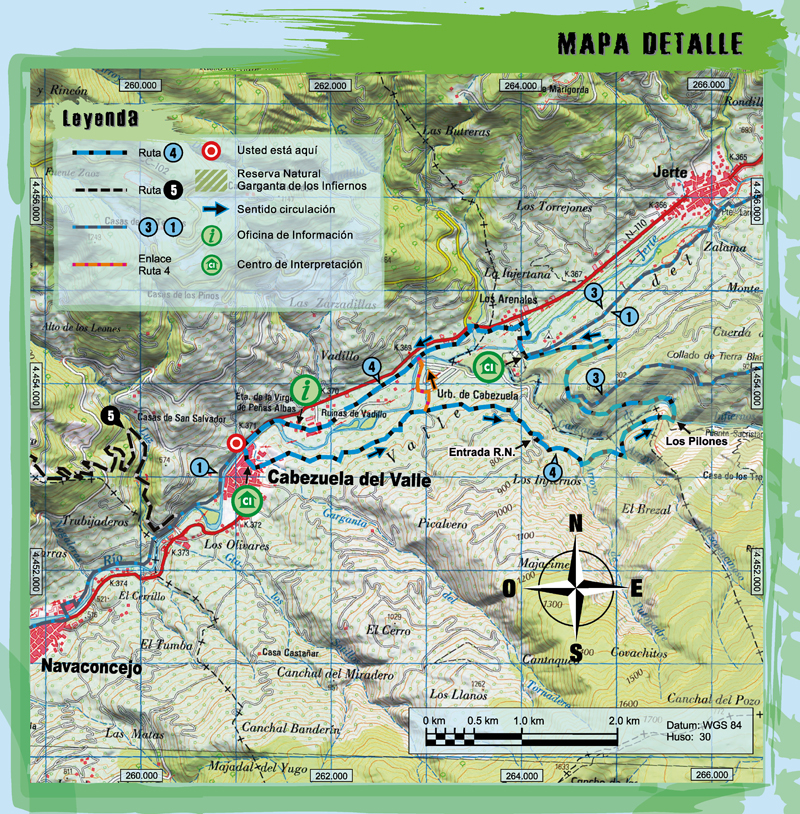 We begin the tour in Cabezuela del Valle, next to the bridge over the river, by crossing the locality in order to leave along calle San Felipe road, leaving the Santiago Hermitage on the left and continuing along a forest track in the direction of the Garganta de los Infiernos Natural Reserve, along the north-facing route. After a few tough ascents, we arrive at the access to the reserve and starting descending amid oak trees as far as the spot known as Los Pilones. There we need to carry our bicycles for a section, but the beauty of the landscape makes it well worth it. We cross the bridge and take the direction of the Interpretive Centre. From here, coinciding with the R-1, we return to the starting point. This route has a short cut at 2.5 km, making it a route of around 3.4 miles, which is ideal for doing as a family.u