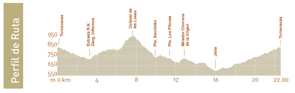From Tornavacas, via the PR-CC 1 Carlos V and the GR 10 on its initial section, we enter the Garganta de los Infiernos Natural Reserve as far as km 8 where, at Collado de Tierra Blanca (or Collado de las Losas), we leave the PR Carlos V to descend along the road as far as Sacristán bridge, cross Los Infiernos ravine and continue along a trail as far as Los Pilones Bridge. Here we can see the reserve’s most famous attraction: Los Pilones. We ascend to the Chorrero de la Virgen waterfall viewpoint and, without leaving the road, connect with the GR 10 near Jerte. Without entering the town, the route passes near the Salmonid Reproduction Centre and takes us to the crossroads with the PR Carlos V and from there to the starting point.