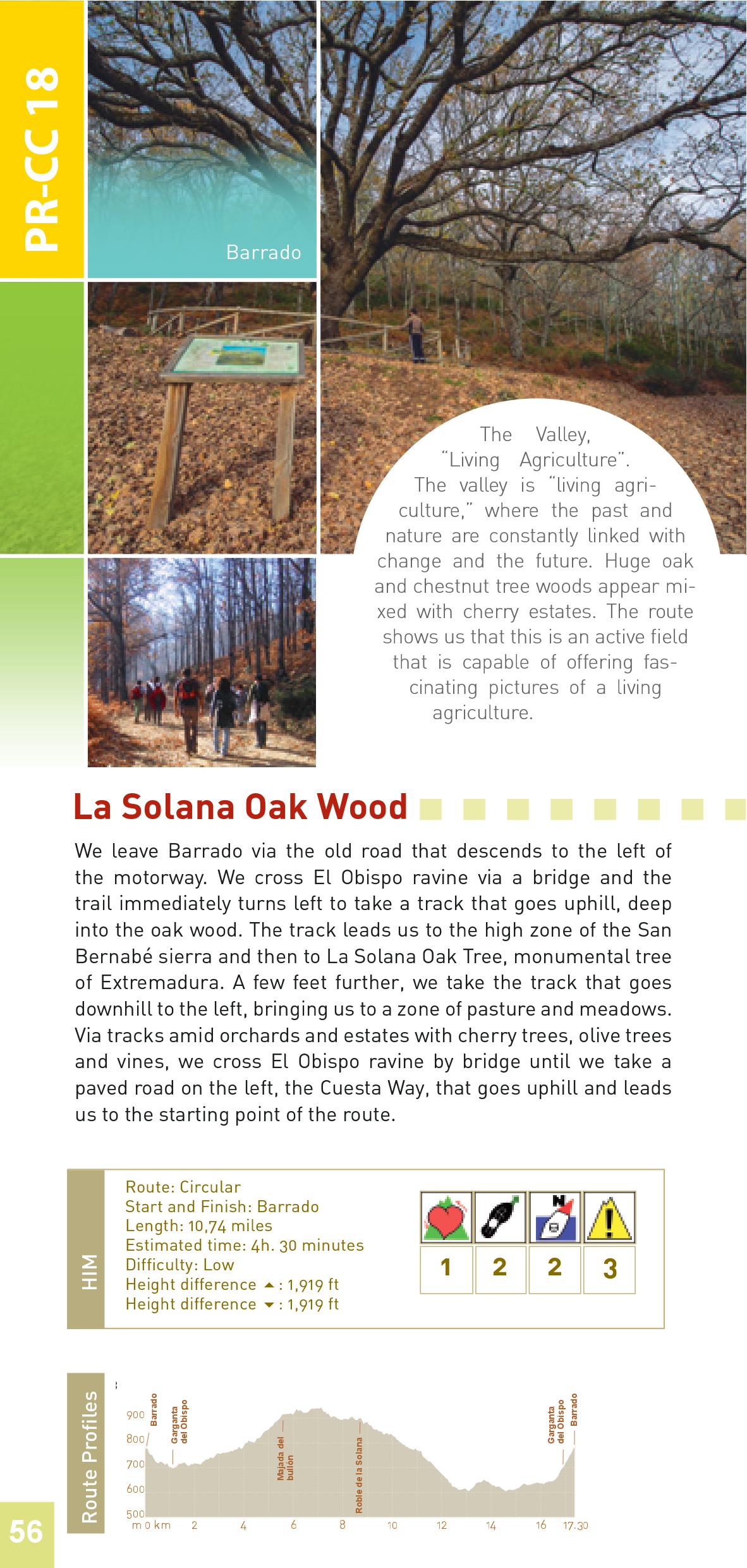 We leave Barrado via the old road that descends to the left of the motorway. We cross El Obispo ravine via a bridge and the trail immediately turns left to take a track that goes uphill, deep into the oak wood. The track leads us to the high zone of the San Bernabé sierra and then to La Solana Oak Tree, monumental tree of Extremadura. A few feet further, we take the track that goes downhill to the left, bringing us to a zone of pasture and meadows. Via tracks amid orchards and estates with cherry trees, olive trees and vines, we cross El Obispo ravine by bridge until we take a paved road on the left, the Cuesta Way, that goes uphill and leads us to the starting point of the route.