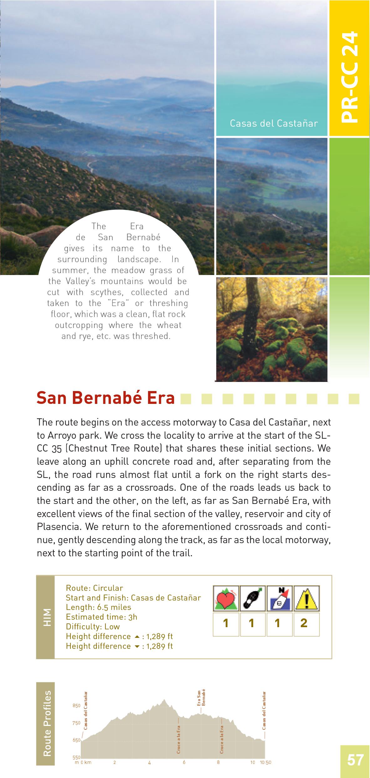 The route begins on the access motorway to Casa del Castañar, next to Arroyo park. We cross the locality to arrive at the start of the SL- CC 35 (Chestnut Tree Route) that shares these initial sections. We leave along an uphill concrete road and, after separating from the SL, the road runs almost flat until a fork on the right starts descending as far as a crossroads. One of the roads leads us back to the start and the other, on the left, as far as San Bernabé Era, with excellent views of the final section of the valley, reservoir and city of Plasencia. We return to the aforementioned crossroads and continue, gently descending along the track, as far as the local motorway, next to the starting point of the trail.