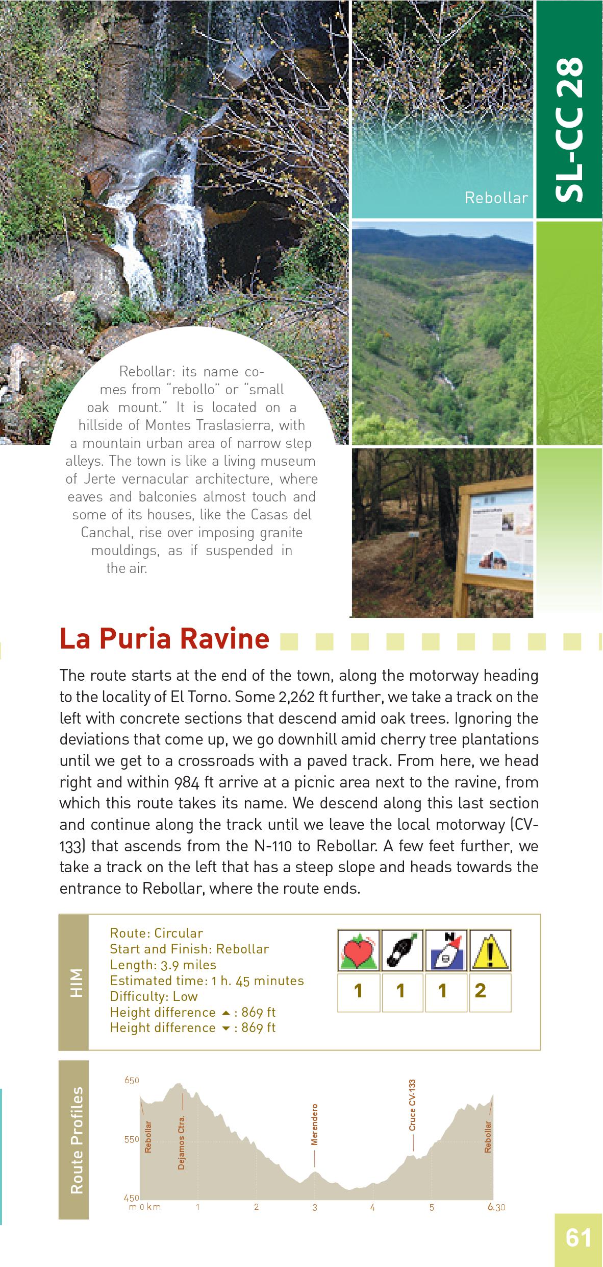 The route starts at the end of the town, along the motorway heading to the locality of El Torno. Some 2,262 ft further, we take a track on the left with concrete sections that descend amid oak trees. Ignoring the deviations that come up, we go downhill amid cherry tree plantations until we get to a crossroads with a paved track. From here, we head right and within 984 ft arrive at a picnic area next to the ravine, from which this route takes its name. We descend along this last section and continue along the track until we leave the local motorway (CV- 133) that ascends from the N-110 to Rebollar. A few feet further, we take a track on the left that has a steep slope and heads towards the entrance to Rebollar, where the route ends.
