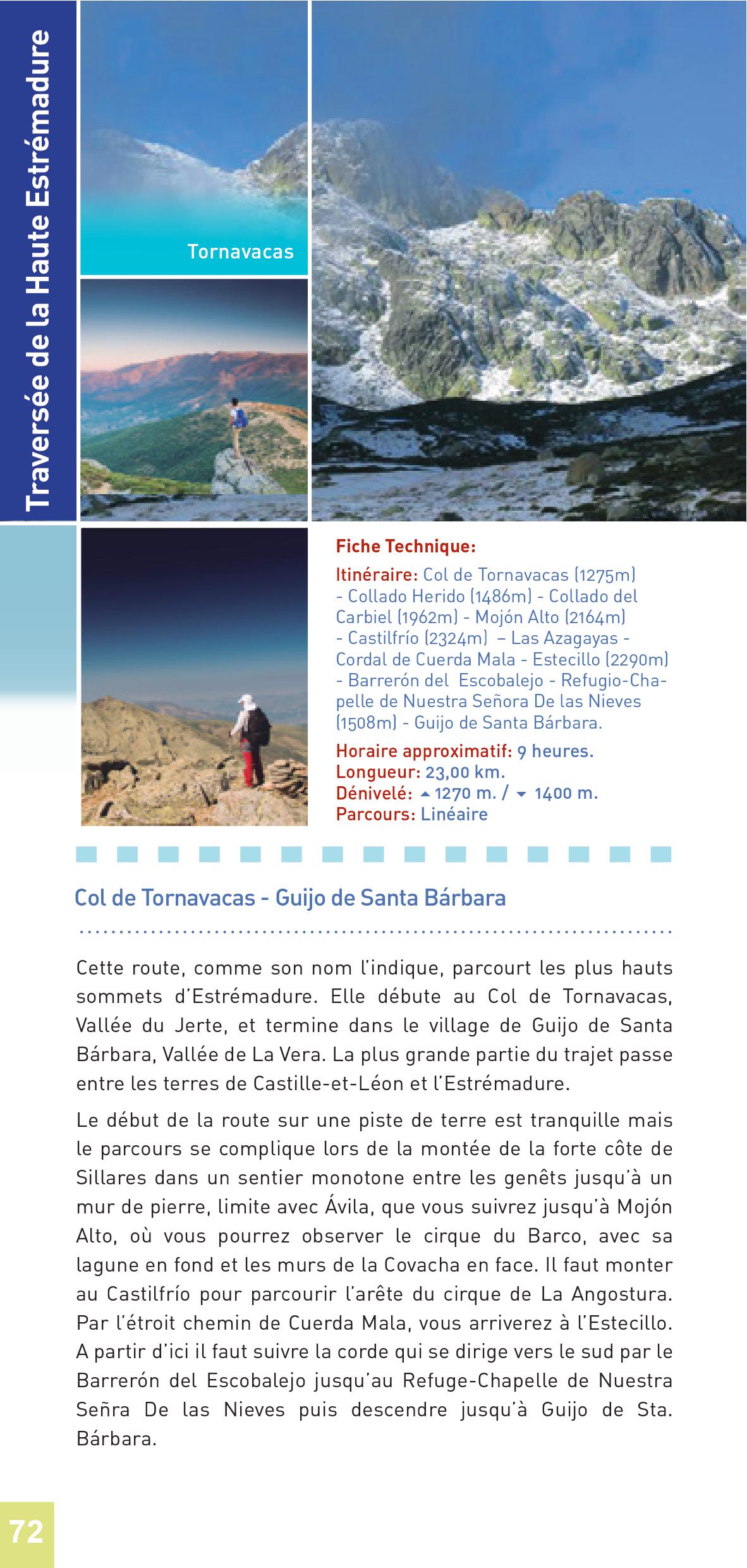 Le début de la route sur une piste de terre est tranquille mais le parcours se complique lors de la montée de la forte côte de Sillares dans un sentier monotone entre les genêts jusqu’à un mur de pierre, limite avec Ávila, que vous suivrez jusqu’à Mojón Alto, où vous pourrez observer le cirque du Barco, avec sa lagune en fond et les murs de la Covacha en face. Il faut monter au Castilfrío pour parcourir l’arête du cirque de La Angostura. Par l’étroit chemin de Cuerda Mala, vous arriverez à l’Estecillo. A partir d’ici il faut suivre la corde qui se dirige vers le sud par le Barrerón del Escobalejo jusqu’au Refuge-Chapelle de Nuestra Señra De las Nieves puis descendre jusqu’à Guijo de Sta. Bárbara.
