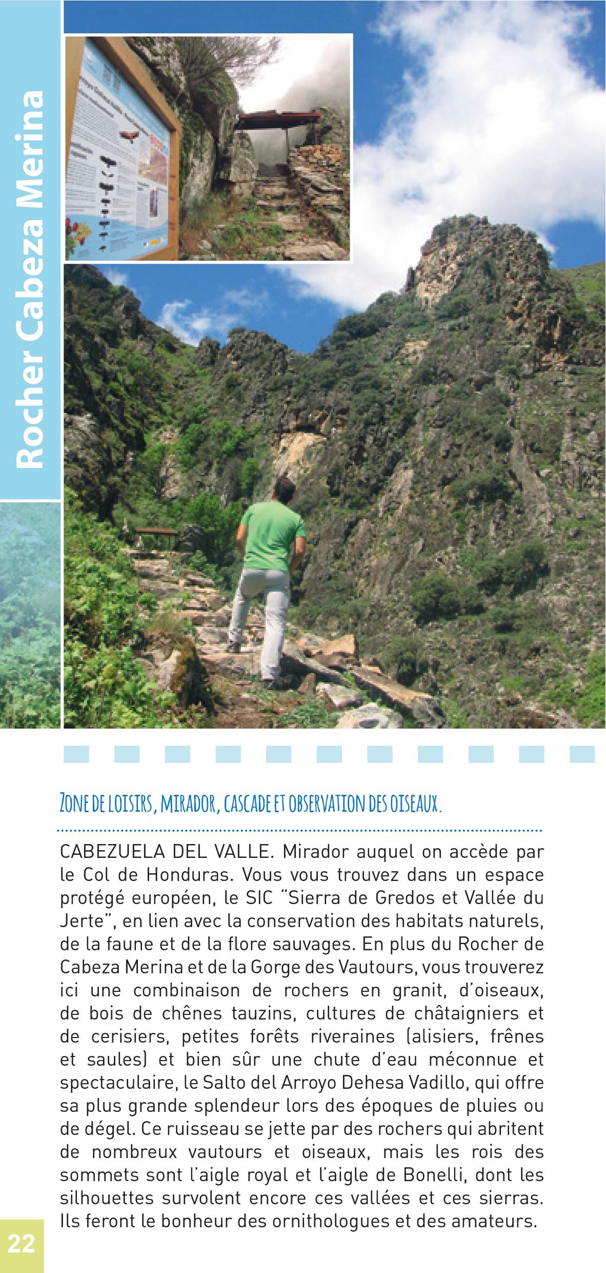 Mirador auquel on accède par le Col de Honduras. Vous vous trouvez dans un espace protégé européen, le SIC “Sierra de Gredos et Vallée du Jerte”, en lien avec la conservation des habitats naturels, de la faune et de la flore sauvages. En plus du Rocher de Cabeza Merina et de la Gorge des Vautours, vous trouverez ici une combinaison de rochers en granit, d’oiseaux, de bois de chênes tauzins, cultures de châtaigniers et de cerisiers, petites forêts riveraines (alisiers, frênes et saules) et bien sûr une chute d’eau méconnue et spectaculaire, le Salto del Arroyo Dehesa Vadillo, qui offre sa plus grande splendeur lors des époques de pluies ou de dégel. Ce ruisseau se jette par des rochers qui abritent de nombreux vautours et oiseaux, mais les rois des sommets sont l’aigle royal et l’aigle de Bonelli, dont les silhouettes survolent encore ces vallées et ces sierras. Ils feront le bonheur des ornithologues et des amateurs.