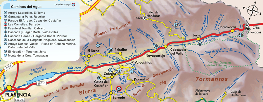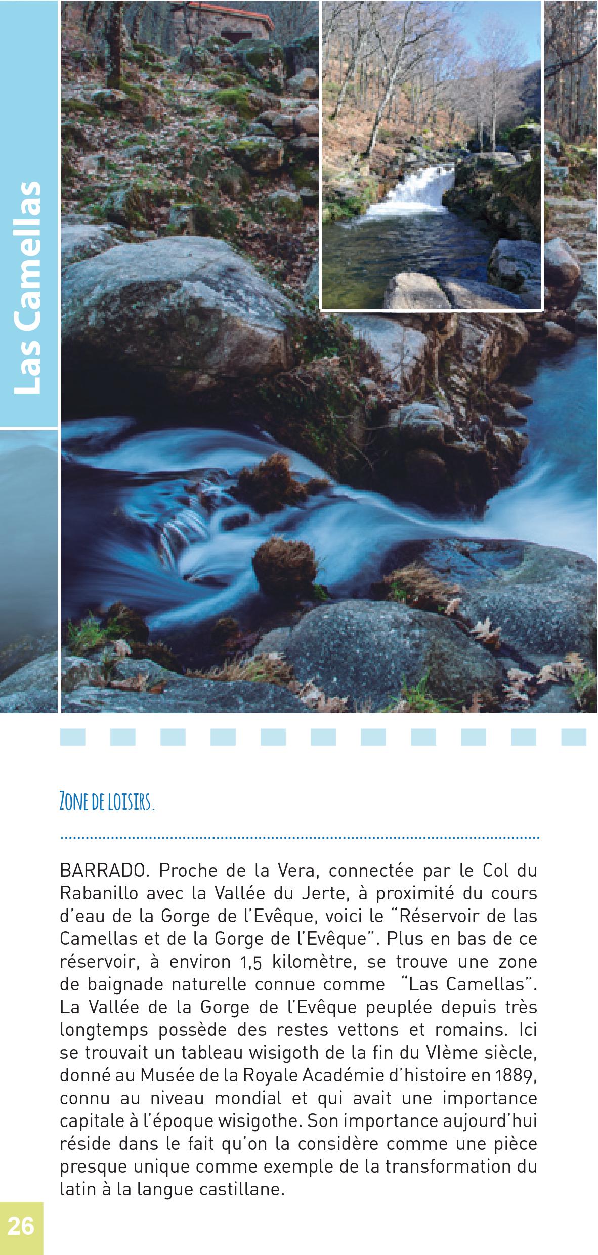 Proche de la Vera, connectée par le Col du Rabanillo avec la Vallée du Jerte, à proximité du cours d’eau de la Gorge de l’Evêque, voici le “Réservoir de las Camellas et de la Gorge de l’Evêque”. Plus en bas de ce réservoir, à environ 1,5 kilomètre, se trouve une zone de baignade naturelle connue comme “Las Camellas”. La Vallée de la Gorge de l’Evêque peuplée depuis très longtemps possède des restes vettons et romains. Ici se trouvait un tableau wisigoth de la fin du VIème siècle, donné au Musée de la Royale Académie d’histoire en 1889, connu au niveau mondial et qui avait une importance capitale à l’époque wisigothe. Son importance aujourd’hui réside dans le fait qu’on la considère comme une pièce presque unique comme exemple de la transformation du latin à la langue castillane.