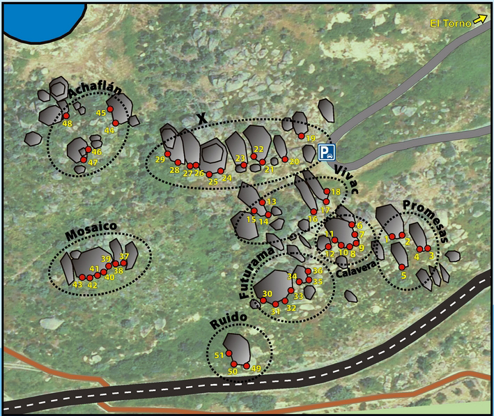 Accès: Depuis la N-110, il faut prendre la route CV-51 qui monte à El Torno. Avant d’arriver au village, vous trouverez sur la droite un dégagement avec un mirador et des sculptures anthropomorphes. Ici se trouve le panneau explicatif de la zone d’escalade.