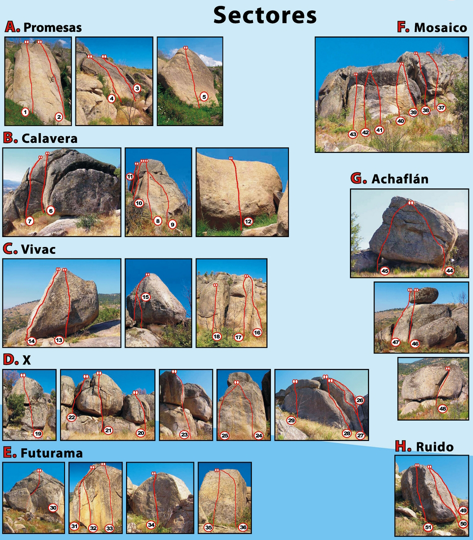 Voies, roche et équipement: La roche est se compose de granit solide non agressif. Plaques d’adhérence avec arêtes émoussées et voies de fissure. Plus de 50 voies avec hauteur variable entre 6 et 18 mètres. 20 blocs propres et marqués. Le degré d’orientation va de III+ à 8.