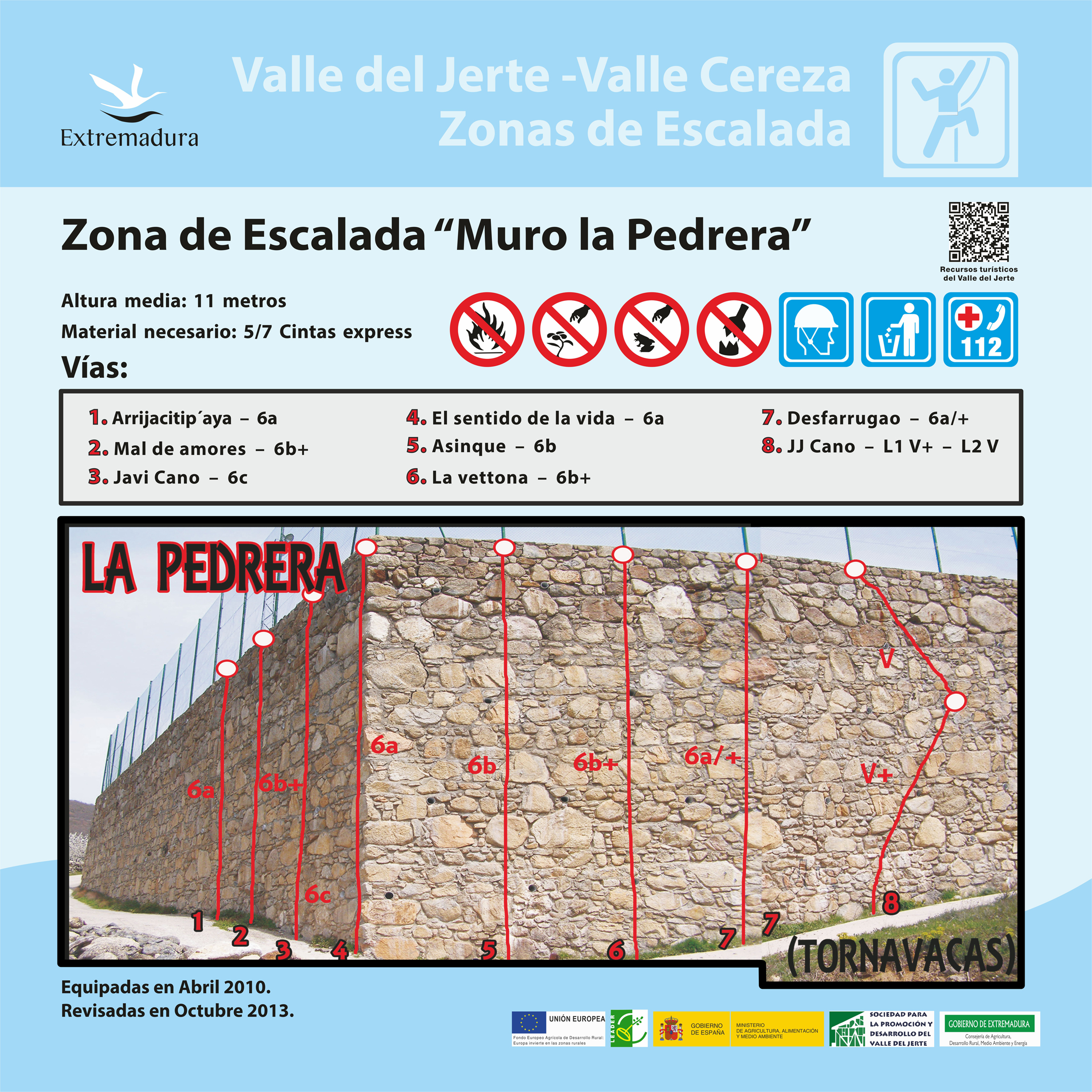 La Vallée du Jerte possède différentes zones d’escalade. Nous vous décrivons les trois les plus utilisées: elles possèdent des panneaux d’information sur les diffé- rentes voies et difficultés.