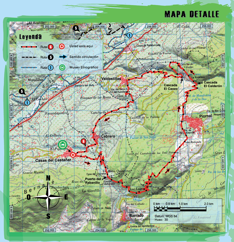 De Casas del Castañar vous monterez au Col du Rabanillo par l’ancienne route. Une fois au sommet, vous descendrez 1 km par la route pour prendre une piste qui monte et qui vous mènera à Piornal. Voici la récompense à vos efforts, une descente de 500 mètres de dénivelé qui va jusqu’à Valdastillas par le Chemin Royal, en passant par le Pont des Moulins au pied de la Cascade du Calderón. Vous continuerez à descendre jusqu’à la route d’IRYDA que vous prendrez à gauche pendant 2 kilomètres en traversant la Gorge Bonal au point connu comme la Cascade El Caozo. En arrivant au croisement des routes, vous prendrez à droite jusqu’à Valdastillas et vous passerez par sa piscine naturelle. Vous traverserez la localité et vous sortirez par une piste de béton qui passe dans des champs de cerisiers et qui vous conduira jusqu’à Cabrero et Casas del Castañar.