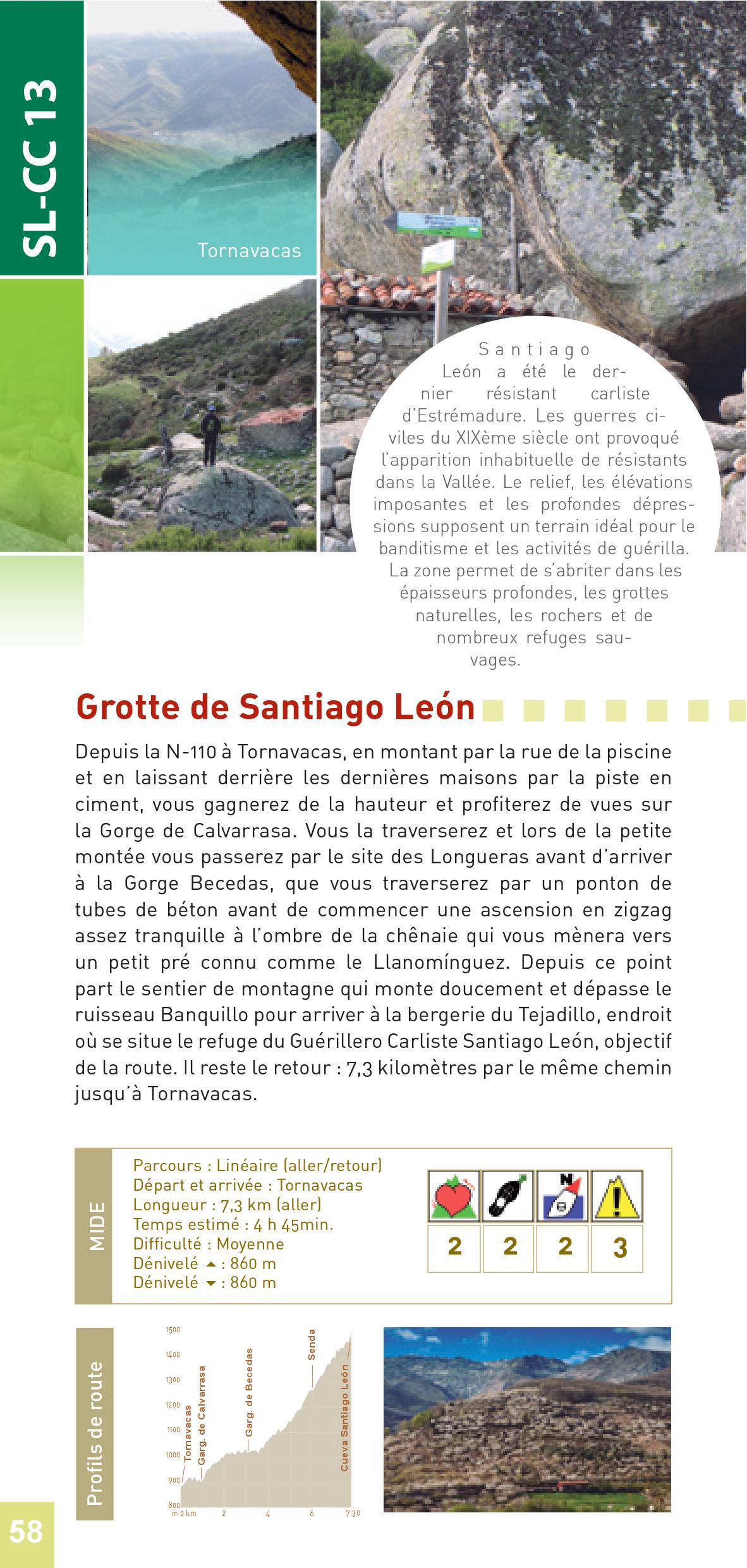 Depuis la N-110 à Tornavacas, en montant par la rue de la piscine et en laissant derrière les dernières maisons par la piste en ciment, vous gagnerez de la hauteur et profiterez de vues sur la Gorge de Calvarrasa. Vous la traverserez et lors de la petite montée vous passerez par le site des Longueras avant d’arriver à la Gorge Becedas, que vous traverserez par un ponton de tubes de béton avant de commencer une ascension en zigzag assez tranquille à l’ombre de la chênaie qui vous mènera vers un petit pré connu comme le Llanomínguez. Depuis ce point part le sentier de montagne qui monte doucement et dépasse le ruisseau Banquillo pour arriver à la bergerie du Tejadillo, endroit où se situe le refuge du Guérillero Carliste Santiago León, objectif de la route. Il reste le retour : 7,3 kilomètres par le même chemin jusqu’à Tornavacas.