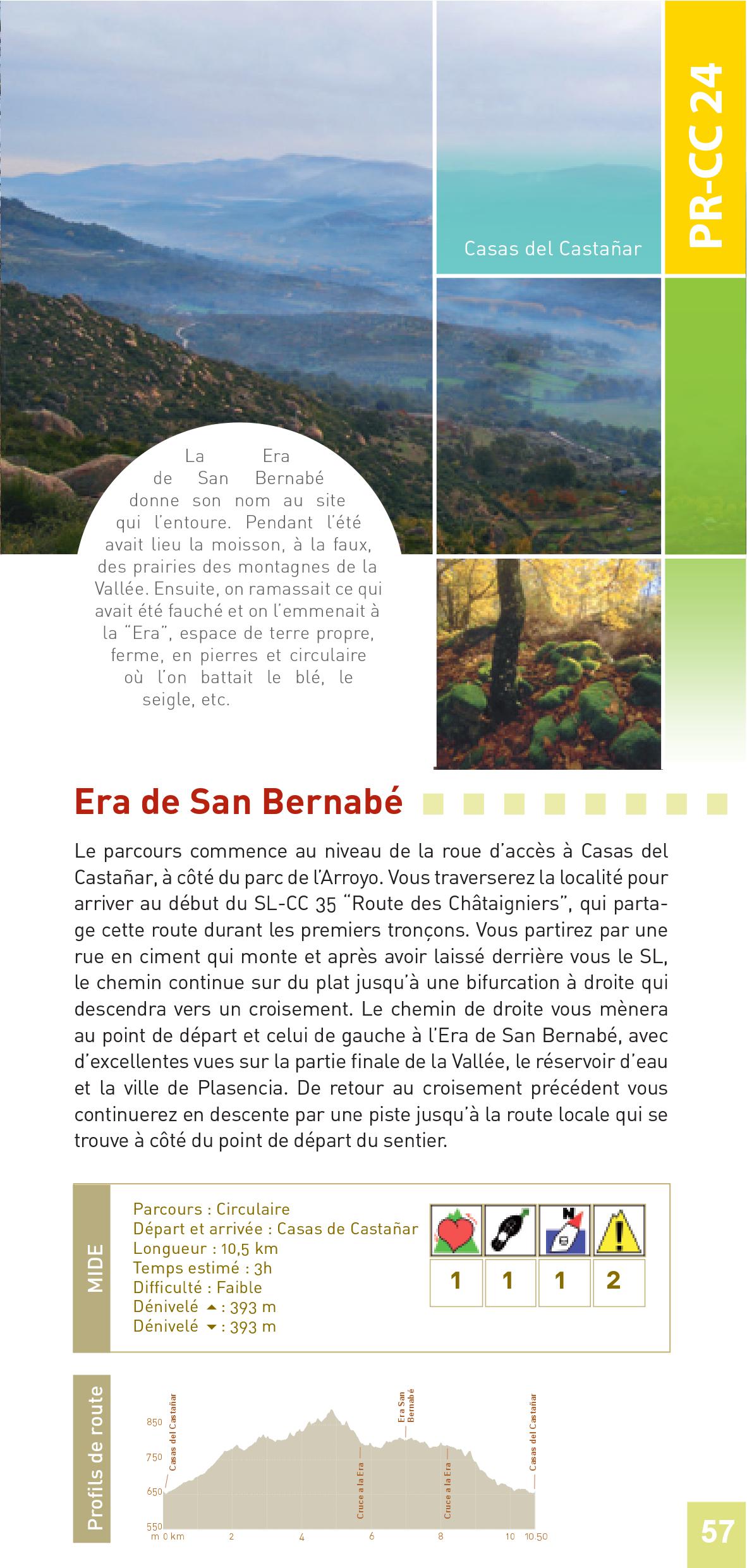 Le parcours commence au niveau de la roue d’accès à Casas del Castañar, à côté du parc de l’Arroyo. Vous traverserez la localité pour arriver au début du SL-CC 35 “Route des Châtaigniers”, qui parta- ge cette route durant les premiers tronçons. Vous partirez par une rue en ciment qui monte et après avoir laissé derrière vous le SL, le chemin continue sur du plat jusqu’à une bifurcation à droite qui descendra vers un croisement. Le chemin de droite vous mènera au point de départ et celui de gauche à l’Era de San Bernabé, avec d’excellentes vues sur la partie finale de la Vallée, le réservoir d’eau et la ville de Plasencia. De retour au croisement précédent vous continuerez en descente par une piste jusqu’à la route locale qui se trouve à côté du point de départ du sentier.