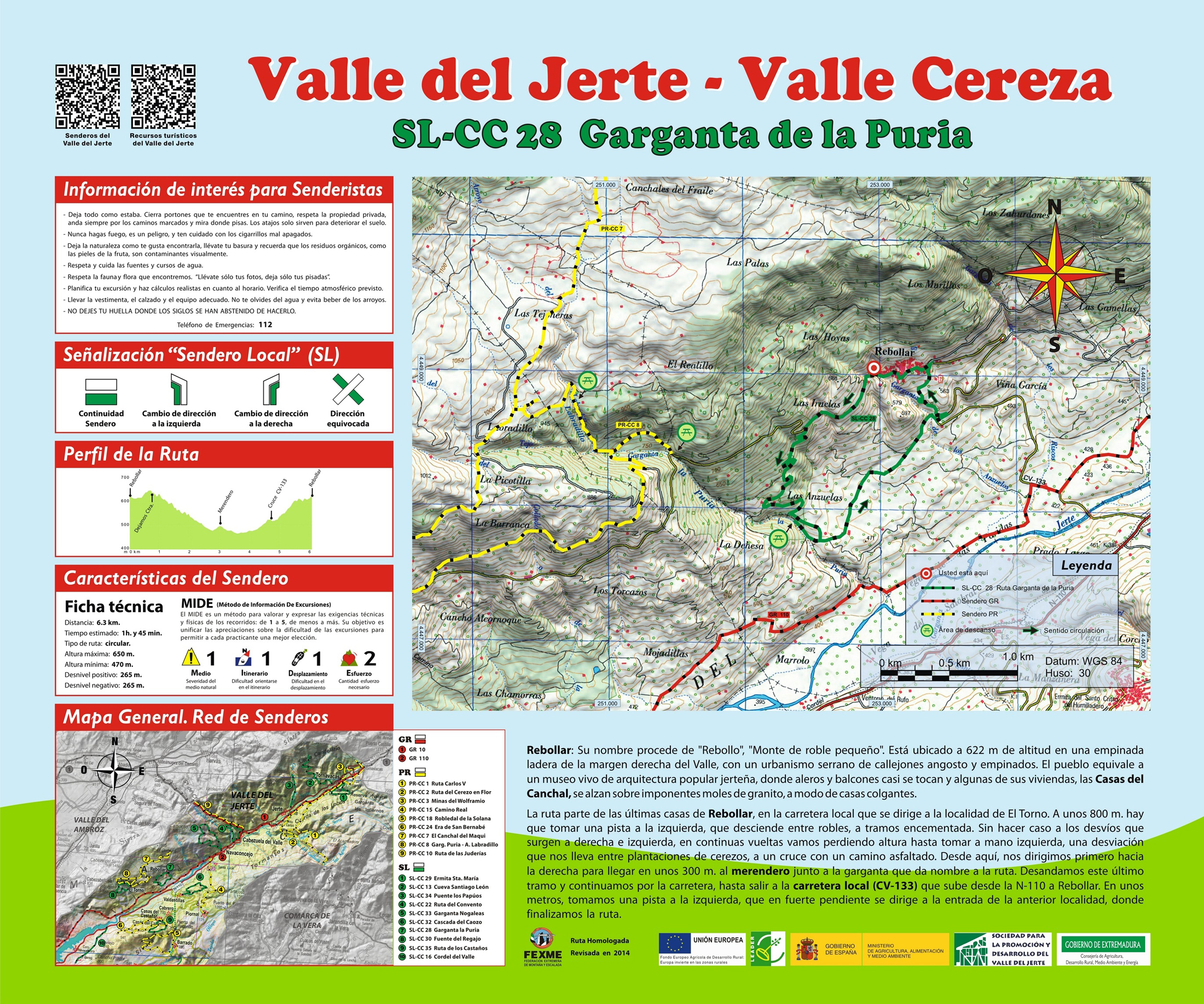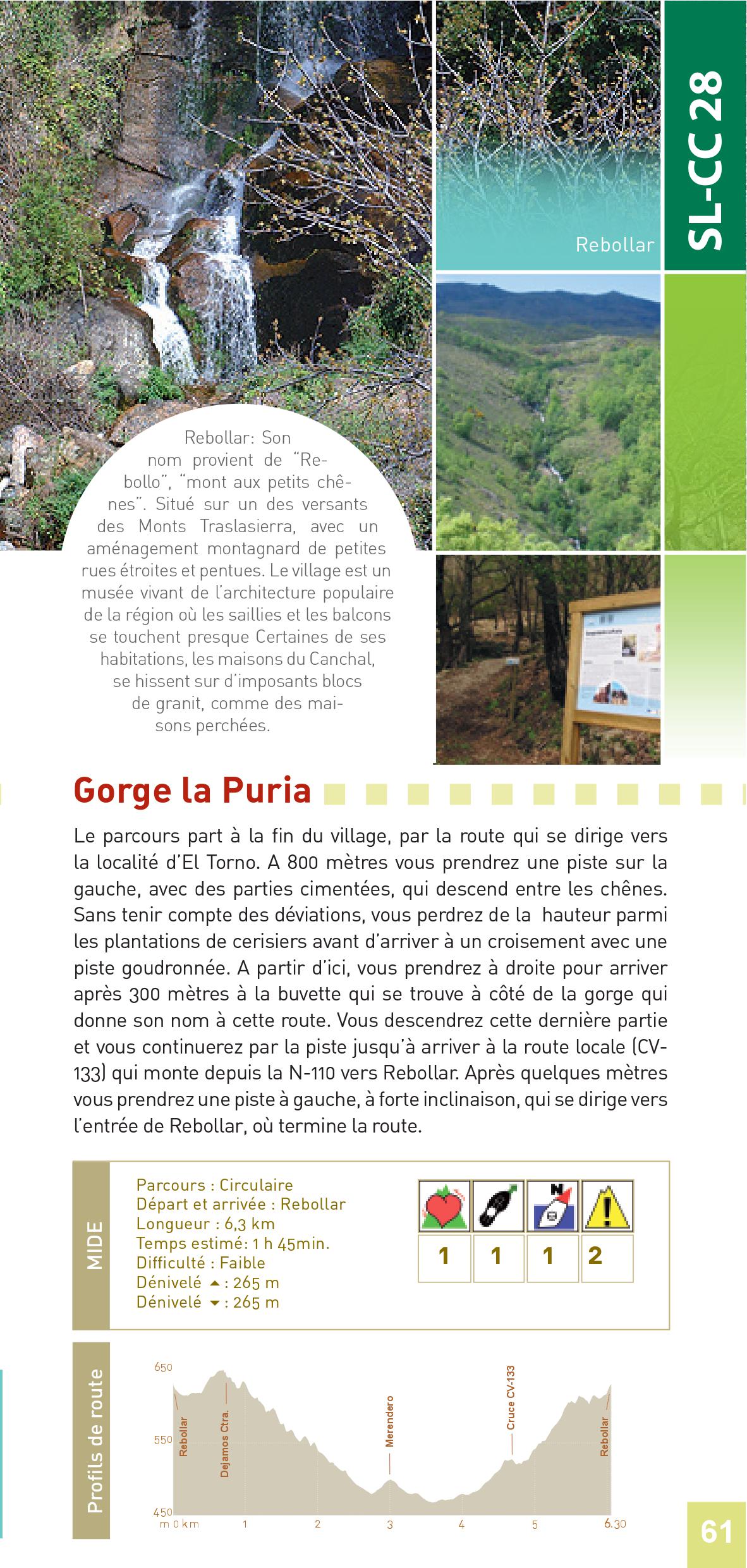 Le parcours part à la fin du village, par la route qui se dirige vers la localité d’El Torno. A 800 mètres vous prendrez une piste sur la gauche, avec des parties cimentées, qui descend entre les chênes. Sans tenir compte des déviations, vous perdrez de la hauteur parmi les plantations de cerisiers avant d’arriver à un croisement avec une piste goudronnée. A partir d’ici, vous prendrez à droite pour arriver après 300 mètres à la buvette qui se trouve à côté de la gorge qui donne son nom à cette route. Vous descendrez cette dernière partie et vous continuerez par la piste jusqu’à arriver à la route locale (CV- 133) qui monte depuis la N-110 vers Rebollar. Après quelques mètres vous prendrez une piste à gauche, à forte inclinaison, qui se dirige vers l’entrée de Rebollar, où termine la route.