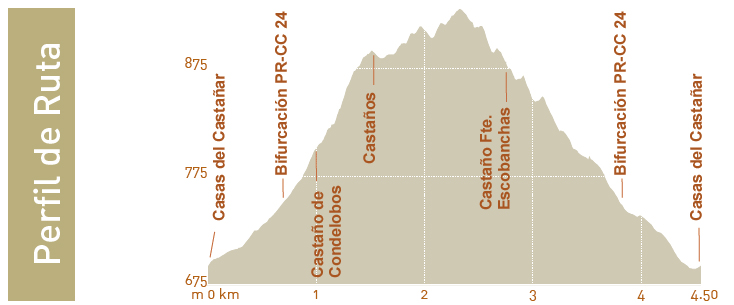 sentier par une rue qui se transforme en un chemin cimenté qui passe entre les propriétés et qui gagne de la hauteur. Il se sépare du PR-CC 24 pour pénétrer dans une zone de châtaigniers où vous pourrez observer le premier châtaignier centenaire, dans le site de Condelobos. Vous continuerez à monter en passant à côté d’autres châtaigniers spectaculaires avant d’arriver à un chemin entre les chênes et un bois clair où vous débuterez la descente en sortant du chemin à la hauteur d’un panneau thématique, à proximité des châtaigniers de la Fontaine de las Escobachas, par un sentier étroit sur la droite. Après quelques mètres vous prendrez un autre chemin en descente qui vous mènera au village et aux premières maisons de Casas del Castañar, où le parcours prend fin.