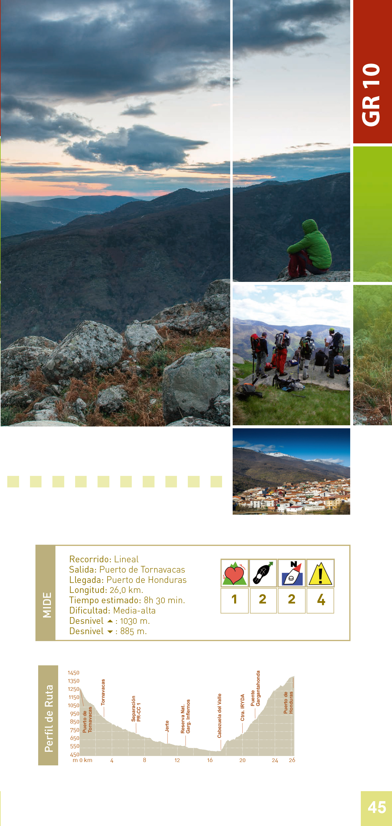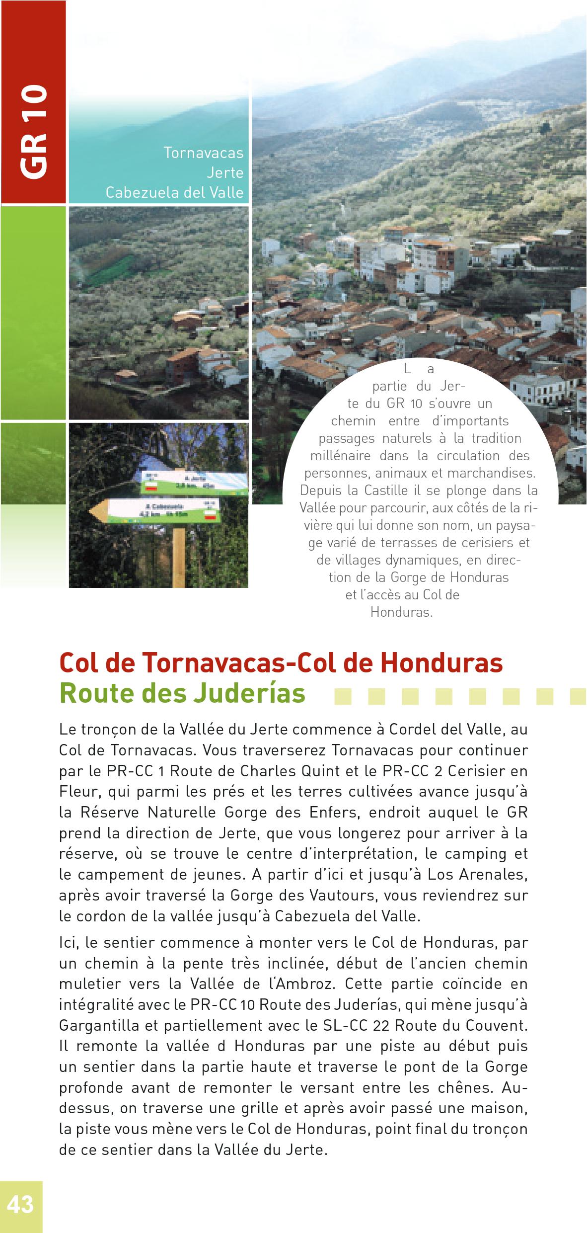La partie du Jerte du GR 10 s’ouvre un chemin entre d’importants passages naturels à la tradition millénaire dans la circulation des personnes, animaux et marchandises. Depuis la Castille il se plonge dans la Vallée pour parcourir, aux côtés de la ri- vière qui lui donne son nom, un paysage varié de terrasses de cerisiers et de villages dynamiques, en direc- tion de la Gorge de Hondura set l’accès au Col de Honduras.