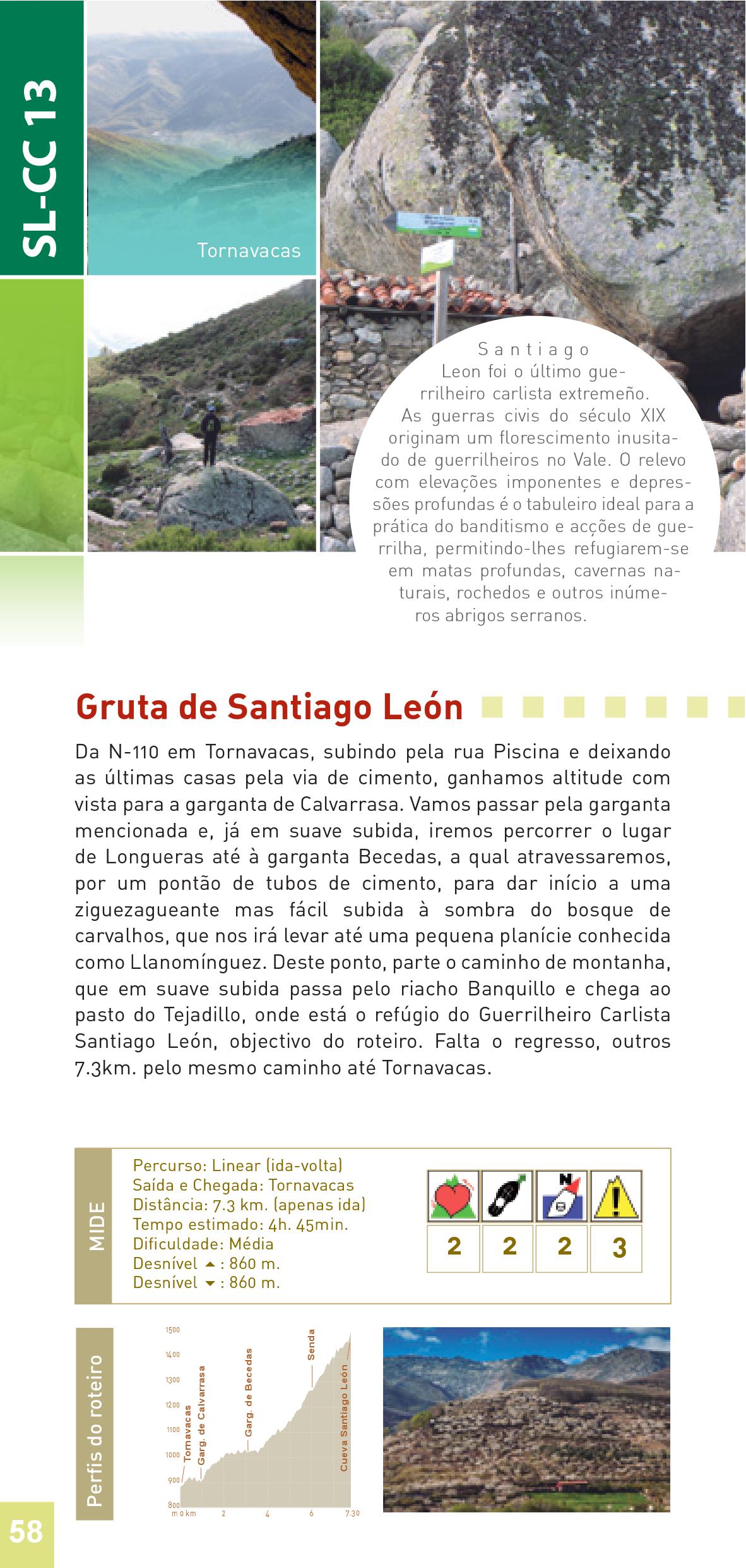 Da N-110 em Tornavacas, subindo pela rua Piscina e deixando as últimas casas pela via de cimento, ganhamos altitude com vista para a garganta de Calvarrasa. Vamos passar pela garganta mencionada e, já em suave subida, iremos percorrer o lugar de Longueras até à garganta Becedas, a qual atravessaremos, por um pontão de tubos de cimento, para dar início a uma ziguezagueante mas fácil subida à sombra do bosque de carvalhos, que nos irá levar até uma pequena planície conhecida como Llanomínguez. Deste ponto, parte o caminho de montanha, que em suave subida passa pelo riacho Banquillo e chega ao pasto do Tejadillo, onde está o refúgio do Guerrilheiro Carlista Santiago León, objectivo do roteiro. Falta o regresso, outros 7.3km. pelo mesmo caminho até Tornavacas.