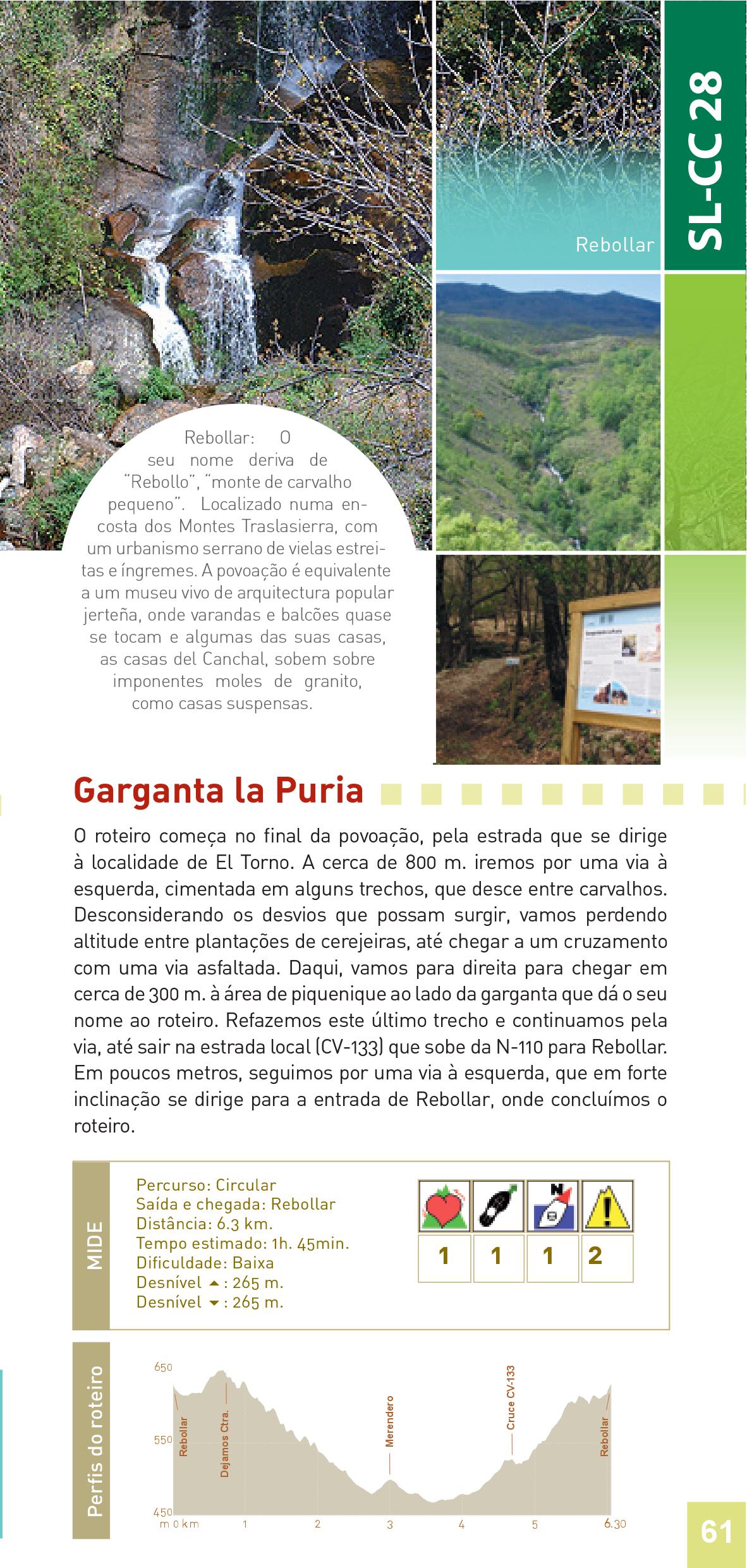 O roteiro começa no final da povoação, pela estrada que se dirige à localidade de El Torno. A cerca de 800 m. iremos por uma via à esquerda, cimentada em alguns trechos, que desce entre carvalhos. Desconsiderando os desvios que possam surgir, vamos perdendo altitude entre plantações de cerejeiras, até chegar a um cruzamento com uma via asfaltada. Daqui, vamos para direita para chegar em cerca de 300 m. à área de piquenique ao lado da garganta que dá o seu nome ao roteiro. Refazemos este último trecho e continuamos pela via, até sair na estrada local (CV-133) que sobe da N-110 para Rebollar. Em poucos metros, seguimos por uma via à esquerda, que em forte inclinação se dirige para a entrada de Rebollar, onde concluímos o roteiro.