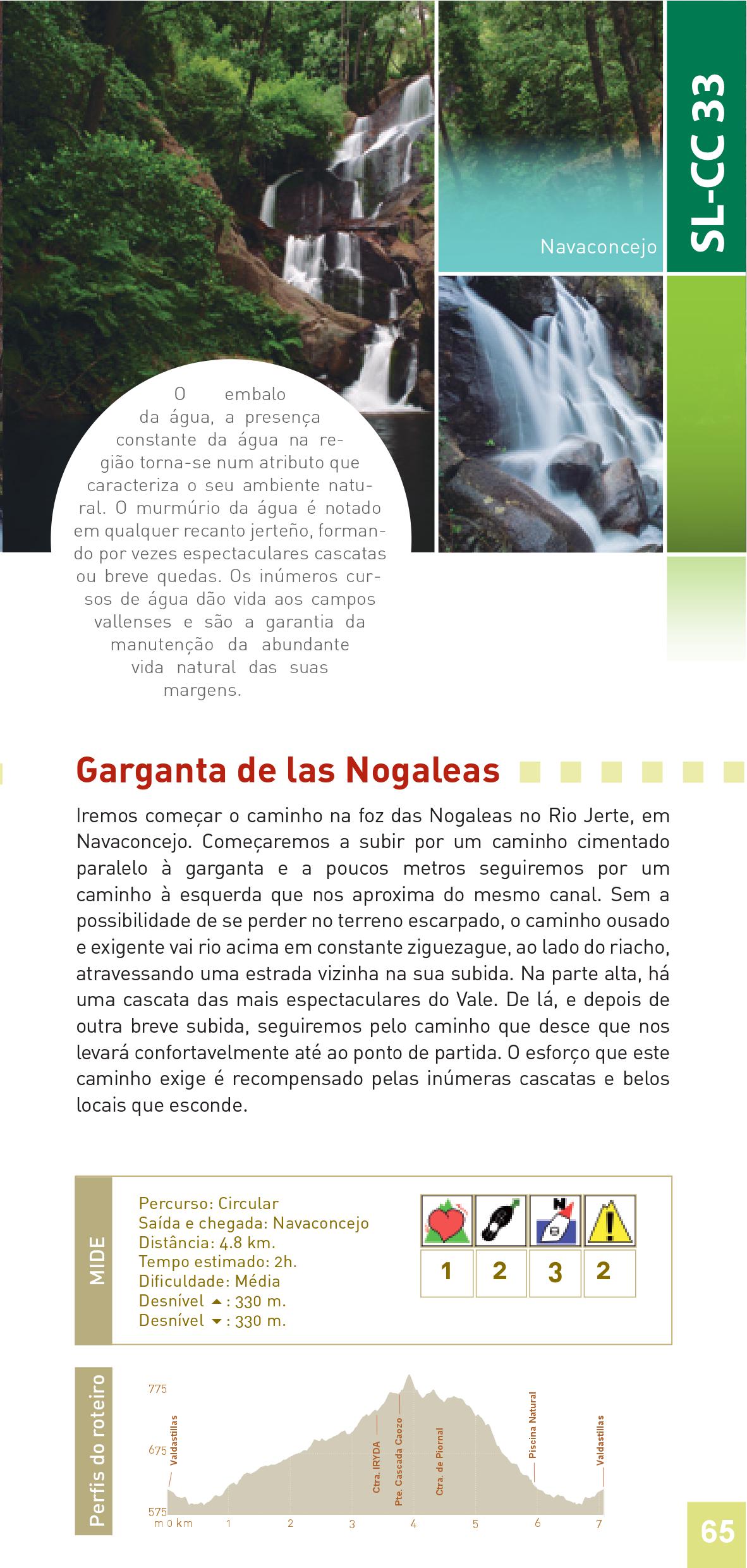 Iremos começar o caminho na foz das Nogaleas no Rio Jerte, em Navaconcejo. Começaremos a subir por um caminho cimentado paralelo à garganta e a poucos metros seguiremos por um caminho à esquerda que nos aproxima do mesmo canal. Sem a possibilidade de se perder no terreno escarpado, o caminho ousado e exigente vai rio acima em constante ziguezague, ao lado do riacho, atravessando uma estrada vizinha na sua subida. Na parte alta, há uma cascata das mais espectaculares do Vale. De lá, e depois de outra breve subida, seguiremos pelo caminho que desce que nos levará confortavelmente até ao ponto de partida. O esforço que este caminho exige é recompensado pelas inúmeras cascatas e belos locais que esconde.