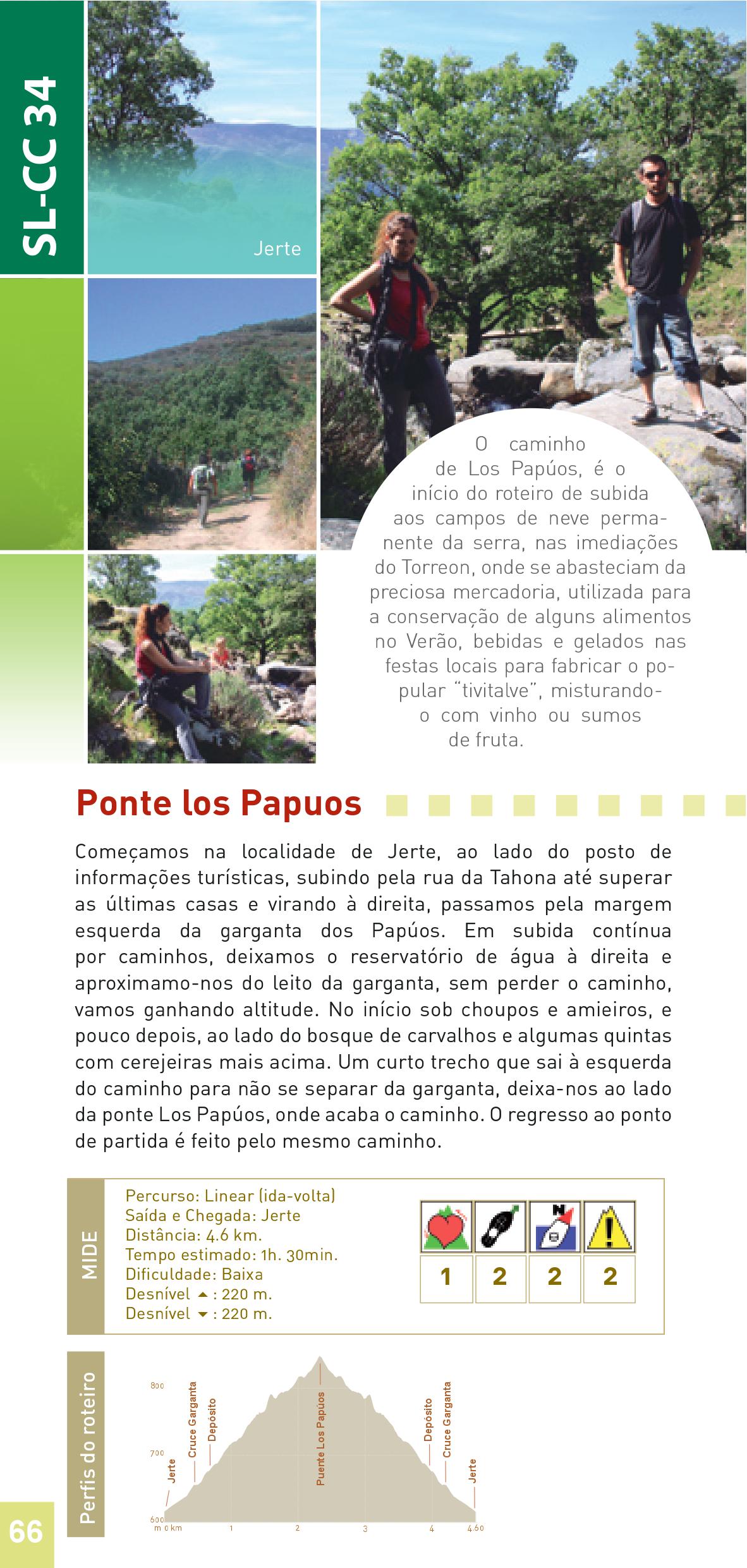 Começamos na localidade de Jerte, ao lado do posto de informações turísticas, subindo pela rua da Tahona até superar as últimas casas e virando à direita, passamos pela margem esquerda da garganta dos Papúos. Em subida contínua por caminhos, deixamos o reservatório de água à direita e aproximamo-nos do leito da garganta, sem perder o caminho, vamos ganhando altitude. No início sob choupos e amieiros, e pouco depois, ao lado do bosque de carvalhos e algumas quintas com cerejeiras mais acima. Um curto trecho que sai à esquerda do caminho para não se separar da garganta, deixa-nos ao lado da ponte Los Papúos, onde acaba o caminho. O regresso ao ponto de partida é feito pelo mesmo caminho.