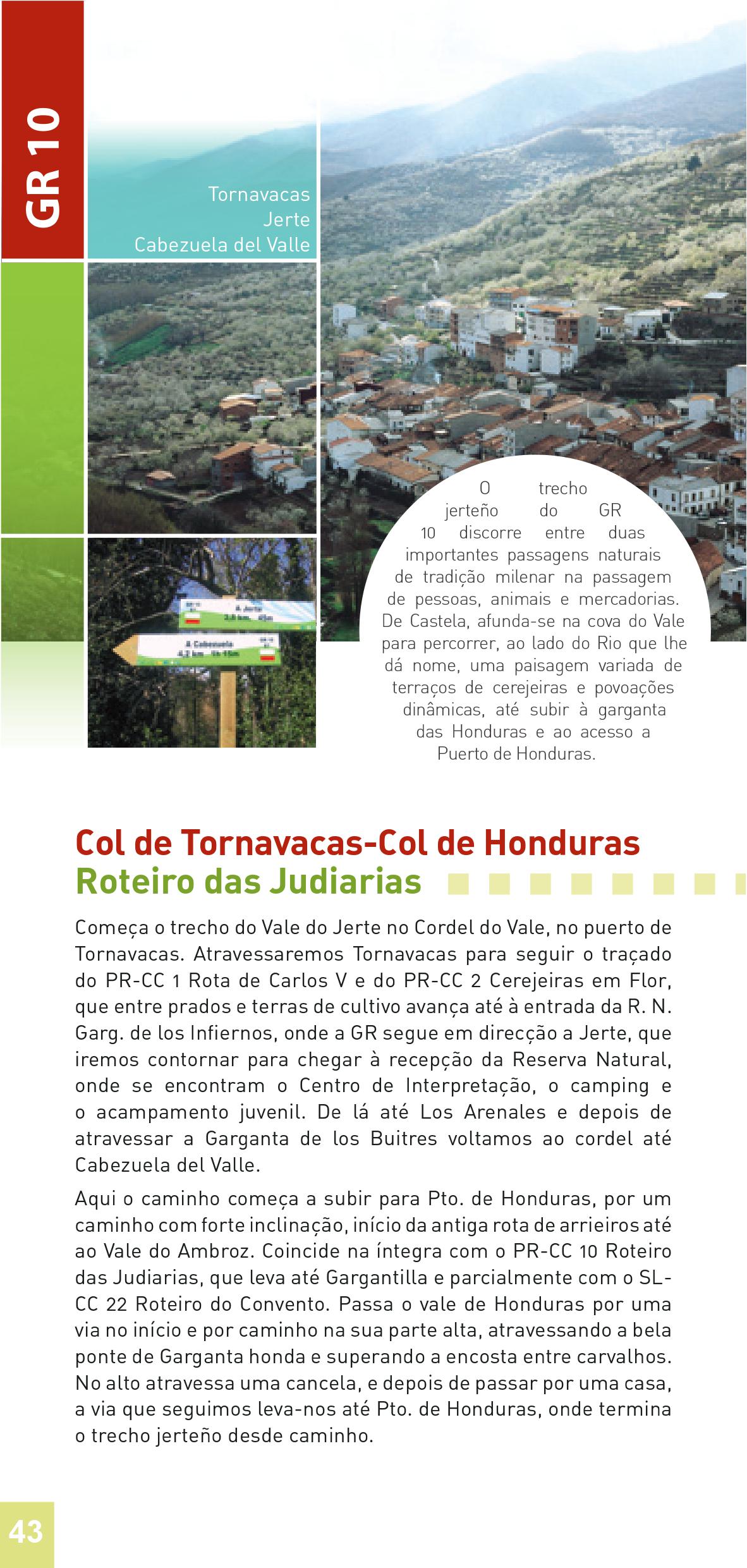 Entre puertos. El tramo jerteño del GR 10 discurre entre dos importantes pasos naturales de tradición milenaria en el paso de personas, animales y mercancías. Desde Castilla, se hunde en la fosa del Valle para recorrer, próximo al río que le da nombre, un variado paisaje de huertos, bancales con frutales y pueblos encantadores. Se separa del eje natural del río, para remontar la garganta de las Honduras. Desde allí, la vista hacia la cuenca del Ambroz se dilata hasta la Sierra de Francia, ya muy cerca de Portugal.