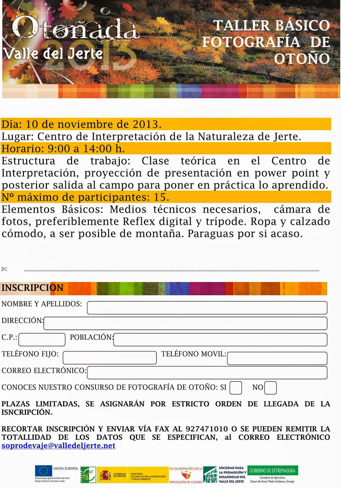 Si eres aficianado/a y te gustaría recibir nociones básicas sobre fotografía de otoño no puedes perderte el taller que este año os ofrecemos desde la Otoñada 2013, se trata de impartir conocimientos útiles y sobre todo animaros a salir a la NATURALEZA del JERTE «armados» con vuestras cámaras a «tratar» de capturar, esos colores que impresionan tanto el alma del «artista».EL TALLER se realizará el día 24 de noviembre de 2013