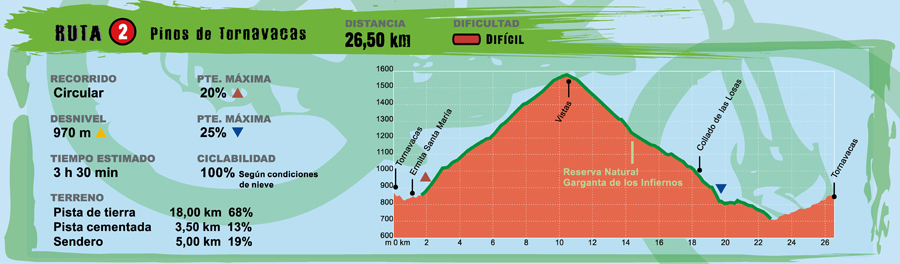 Estamos en la cabecera del Valle del Jerte, en la falda de la Sierra de Tormantos. Tornavacas está marcada por su condición fronteriza, ya que era el primer pueblo que alcanzaban los rebaños de la Mesta provenientes de la meseta de Castilla. Fruto de su prosperidad fue el ennoblecimiento de sus casas, apreciable en los blasones nobiliarios y dinteles de granito, como en la que pernoctó el emperador Carlos V en 1556, camino de su retiro al Monasterio de Yuste. Iniciaremos la ruta por el camino cementado paralelo al río Jerte, parte del PR-CC 1 Ruta de Carlos V. Pasaremos por las ruinas de la Ermita de Sta. María hasta la parte alta del valle, a 1561 m tras 1O km y 800 m de desnivel. Es una dura subida, pero la pista es muy llevadera y se rueda fácilmente. Una vez arriba, las vistas del valle y de la zona de alta montaña de la Reserva Natural Garganta de los Infiernos, harán que olvidemos el esfuerzo del ascenso. En invierno es fácil encontrar nieve en la pista, incluso puede hacernos difícil o imposible realizar la ruta, infórmate antes de las condiciones de la ruta. La larga bajada, de 11 km y 850 m de desnivel, hará las delicias de los amantes del descenso. El primer tramo es rápido, por anchas pistas a tramos cementados. Al llegar al Collado de las Losas (Km 18.9) nos adentraremos en un sendero (atentos para no pasarlo) que discurre entre bosques de roble y castaño, zonas trialeras y técnicas que rematan un descenso que no te dejará indiferente. Para finalizar nuestro recorrido tendremos que remontar hasta Tornavacas, se trata de una cómoda pista que asciende poco a poco, junto al río Jerte, hasta el punto de inicio.