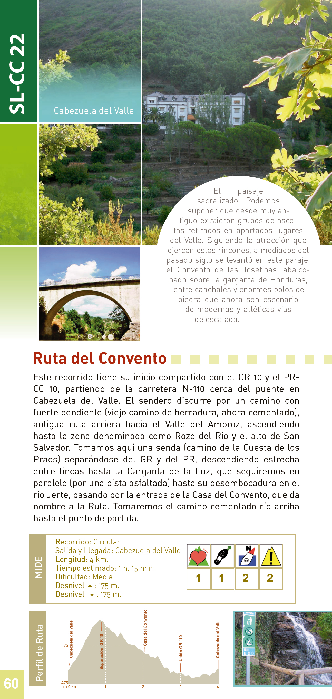 Este recorrido tiene su inicio compartido con el GR 10 y el PR-CC 10, partiendo de la carretera N-110 cerca del puente en Cabezuela del Valle. El sendero discurre por un camino con fuerte pendiente (viejo camino de herradura, ahora cementado), antigua ruta arriera hacia el Valle del Ambroz, ascendiendo hasta la zona denominada como Rozo del Río y el alto de San Salvador. Tomamos aquí una senda (camino de la Cuesta de los Praos) separándose del GR y del PR, descendiendo estrecha entre fincas hasta la Garganta de la Luz, que seguiremos en paralelo (por una pista asfaltada) hasta su desembocadura en el río Jerte, pasando por la entrada de la Casa del Convento, que da nombre a la Ruta. Tomaremos el camino cementado río arriba hasta el punto de partida.