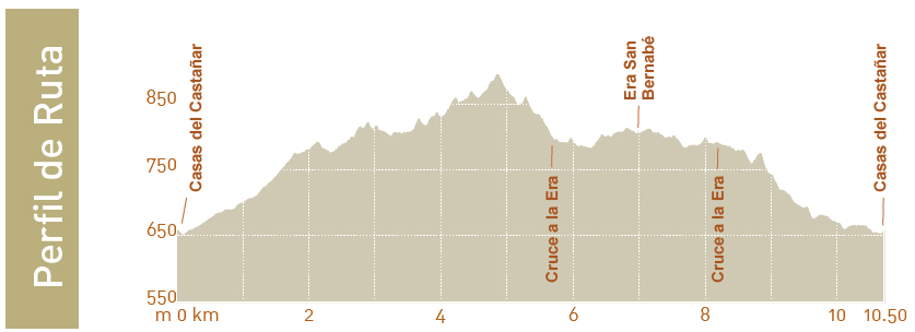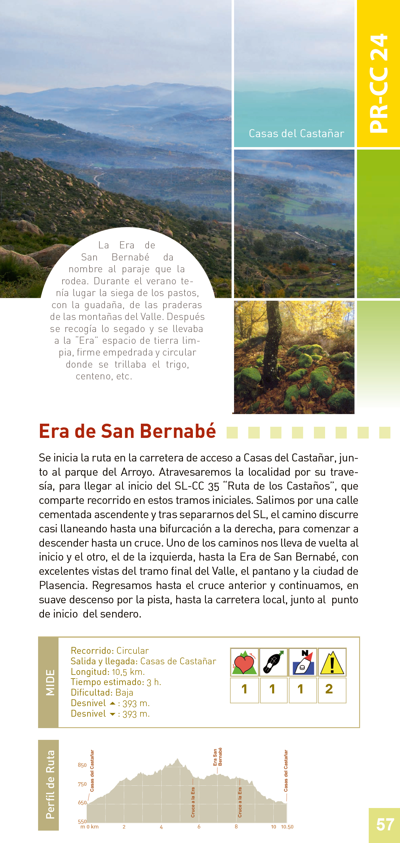 Se inicia la ruta en la carretera de acceso a Casas del Castañar, junto al parque del Arroyo. Atravesaremos la localidad por su travesía, para llegar al inicio del SL-CC 35 "Ruta de los Castaños", que comparte recorrido en estos tramos iniciales. Salimos por una calle cementada ascendente y tras separarnos del SL, el camino discurre casi llaneando hasta una bifurcación a la derecha, para comenzar a descender hasta un cruce. Uno de los caminos nos lleva de vuelta al inicio y el otro, el de la izquierda, hasta la Era de San Bernabé, con excelentes vistas del tramo final del Valle, con el pantano y la ciudad de Plasencia. Regresamos hasta el cruce anterior y continuamos, en suave descenso por la pista, hasta la carretera local, junto al punto de inicio del sendero.