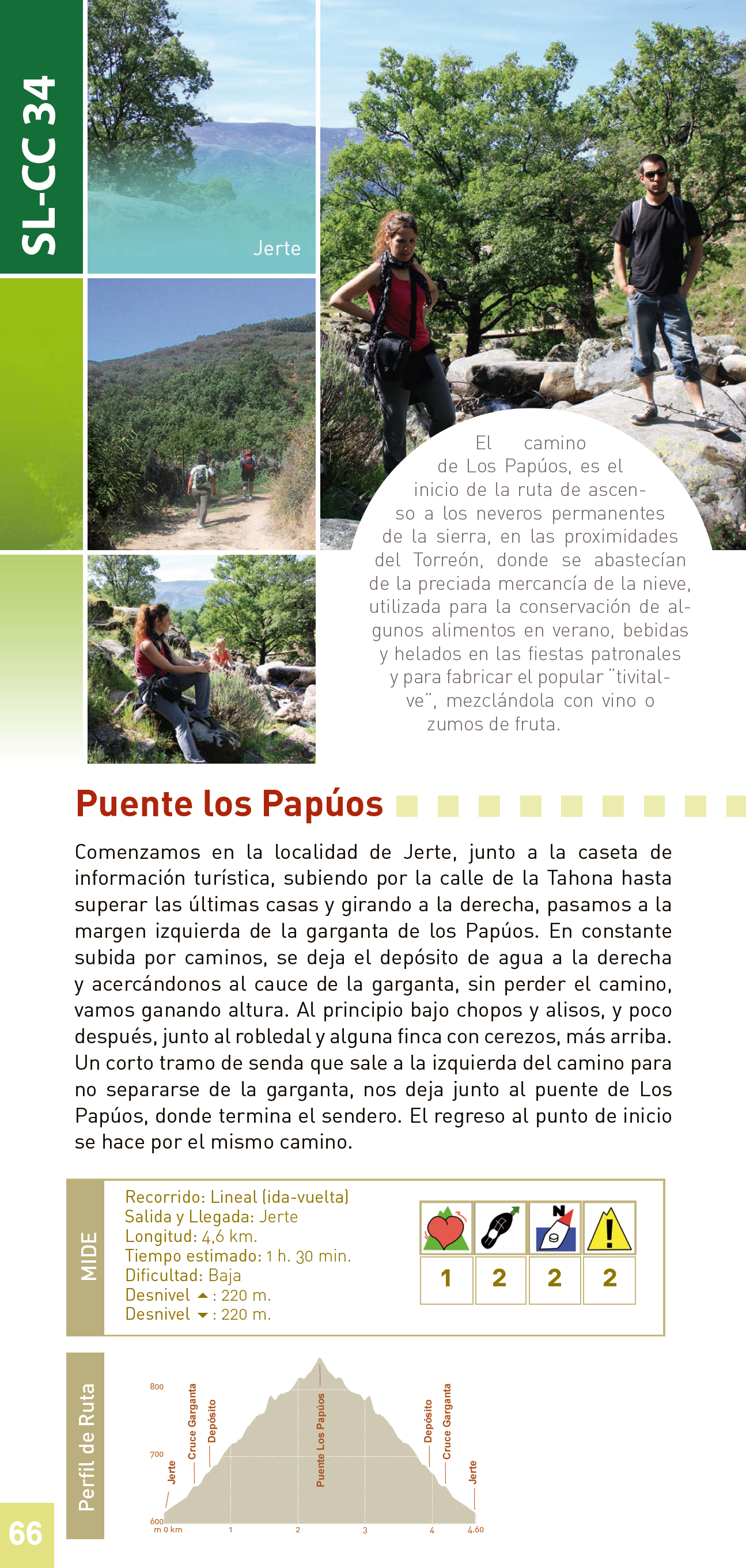 Comenzamos en la localidad de Jerte, junto a la caseta de información turística, subiendo por la calle de la Tahona hasta superar las últimas casas y torciendo a la derecha, pasamos a la margen izquierda de la garganta de los Papúos. En constante subida por caminos, se deja el depósito de agua a la derecha y acercándonos constantemente al cauce de la garganta, sin perder el camino, vamos ganamos altura, al principio bajo chopos y alisos y poco después junto al robledal y alguna finca con cerezos más arriba. Un corto tramo de senda que sale a la izquierda del camino para no separarse de la garganta, nos deja junto al puente de Los Papúos, donde termina el sendero. El regreso al punto de inicio se hace por el mismo camino.