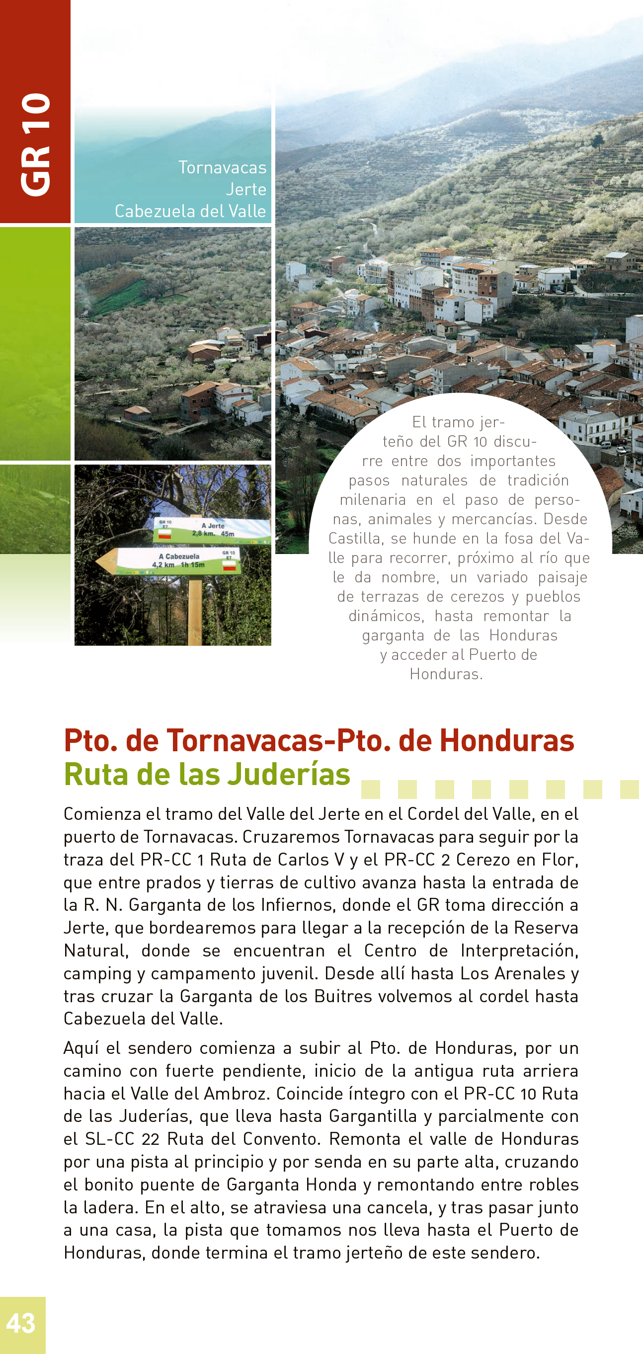 Entre puertos. El tramo jerteño del GR 10 discurre entre dos importantes pasos naturales de tradición milenaria en el paso de personas, animales y mercancías. Desde Castilla, se hunde en la fosa del Valle para recorrer, próximo al río que le da nombre, un variado paisaje de huertos, bancales con frutales y pueblos encantadores. Se separa del eje natural del río, para remontar la garganta de las Honduras. Desde allí, la vista hacia la cuenca del Ambroz se dilata hasta la Sierra de Francia, ya muy cerca de Portugal.