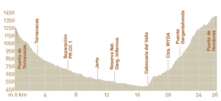 Comienza el tramo del Valle del Jerte en el Cordel del Valle, en el puerto de Tornavacas. Cruzaremos Tornavacas para seguir por la traza del PR-CC 1 Ruta de Carlos V y el PR-CC 2 Cerezo en Flor, que entre prados y tierras de cultivo avanza hasta la entrada de la R. N. Garg. de los Infiernos, donde el GR toma dirección a Jerte, que bordearemos para llegar a la recepción de la Reserva Natural, donde se encuentran el Centro de Interpretación, camping y campamento juvenil. Desde allí hasta Los Arenales y tras cruzar la Garganta de los Buitres volvemos al cordel hasta Cabezuela del Valle. Aquí el sendero comienza subir al Pto. de Honduras, por un camino con fuerte pendiente, inicio de la antigua ruta arriera hacia el Valle del Ambroz. Coincide íntegro con el PR-CC 10 Ruta de las Juderías, que lleva hasta Gargantilla y parcialmente con el SL-CC 22 Ruta del Convento. Remonta el valle de Honduras por una pista al principio y por senda en su parte alta, cruzando el bonito puente de Garganta honda y remontando entre robles la ladera. En el alto, se atraviesa una cancela, y tras pasar junto a una casa, la pista que tomamos nos lleva hasta el Pto. de Honduras, donde termina el tramo jerteño de este sendero.